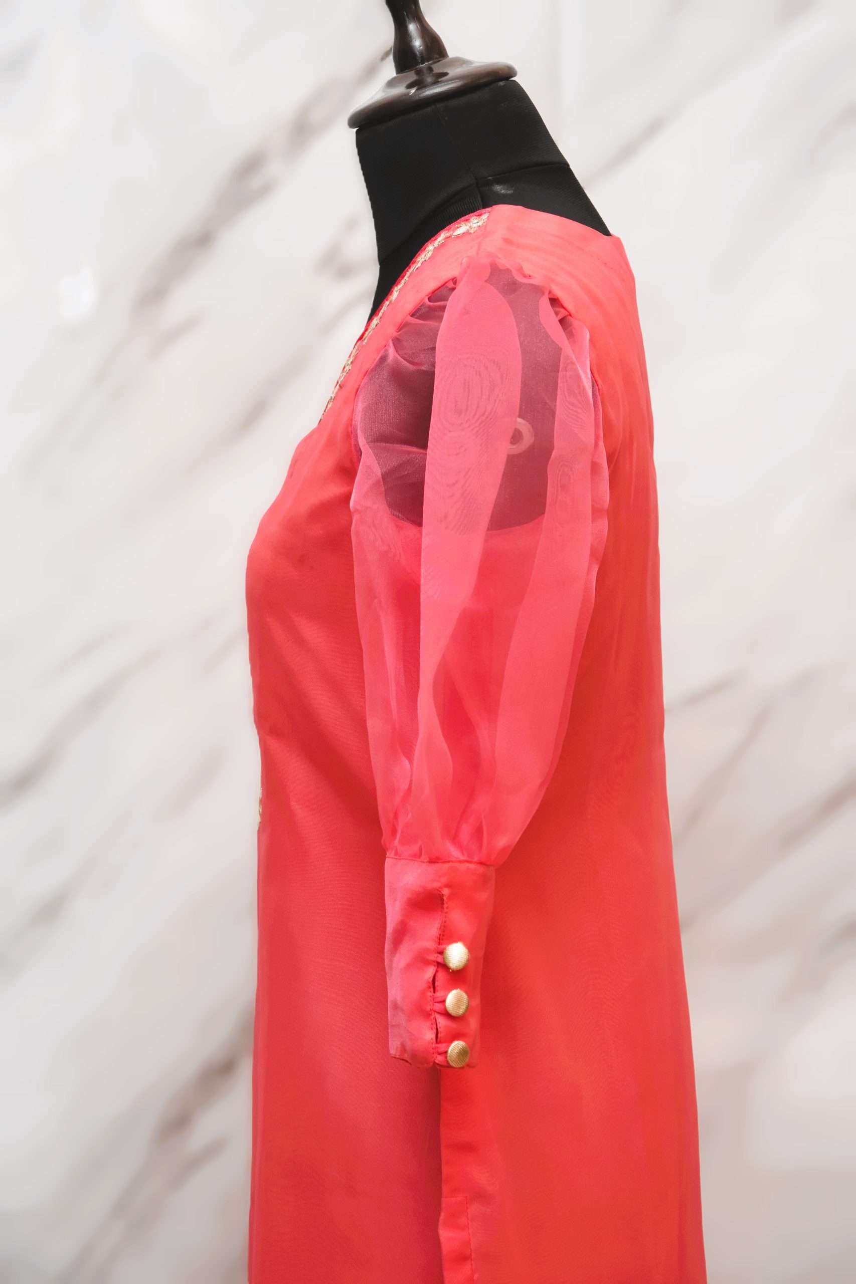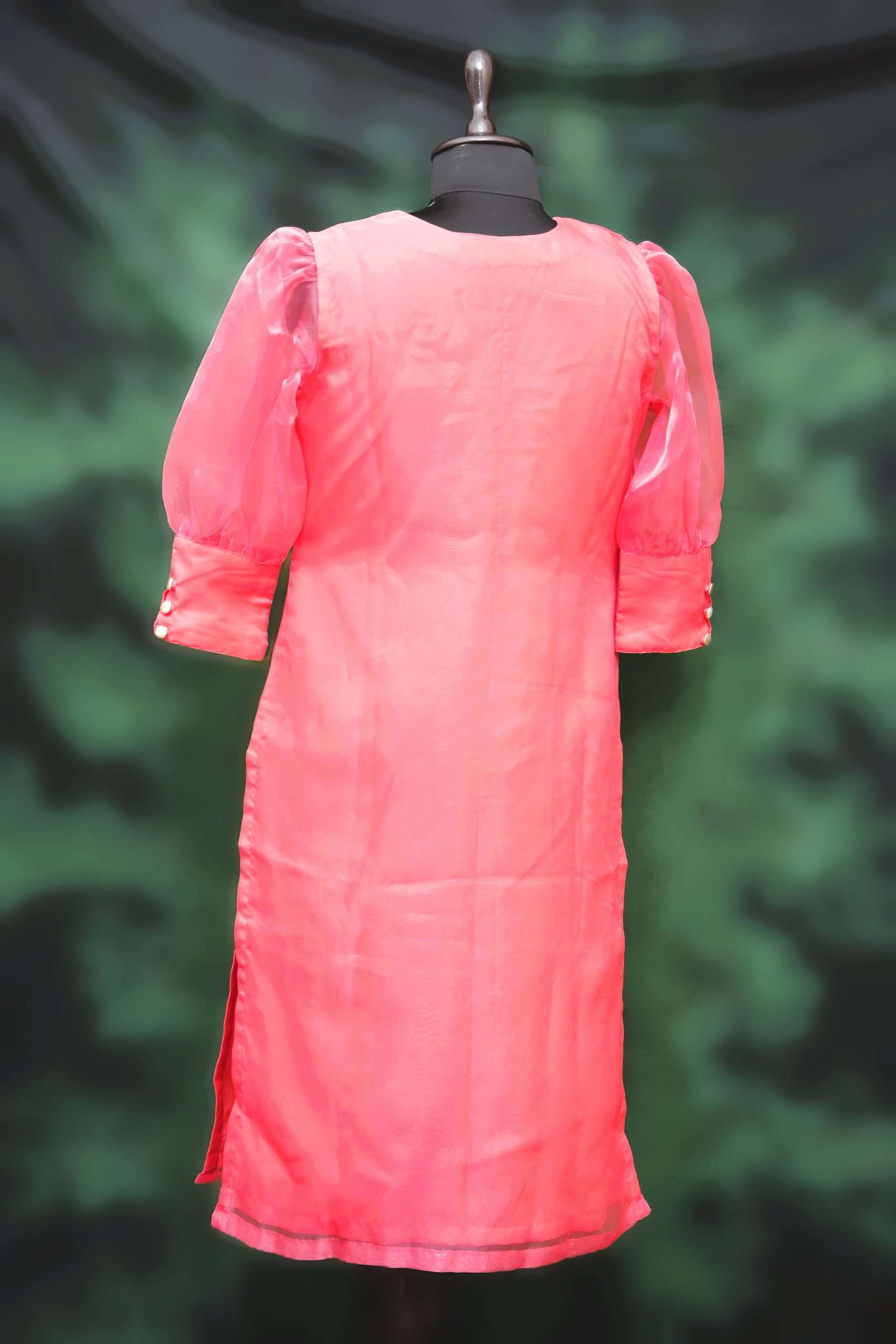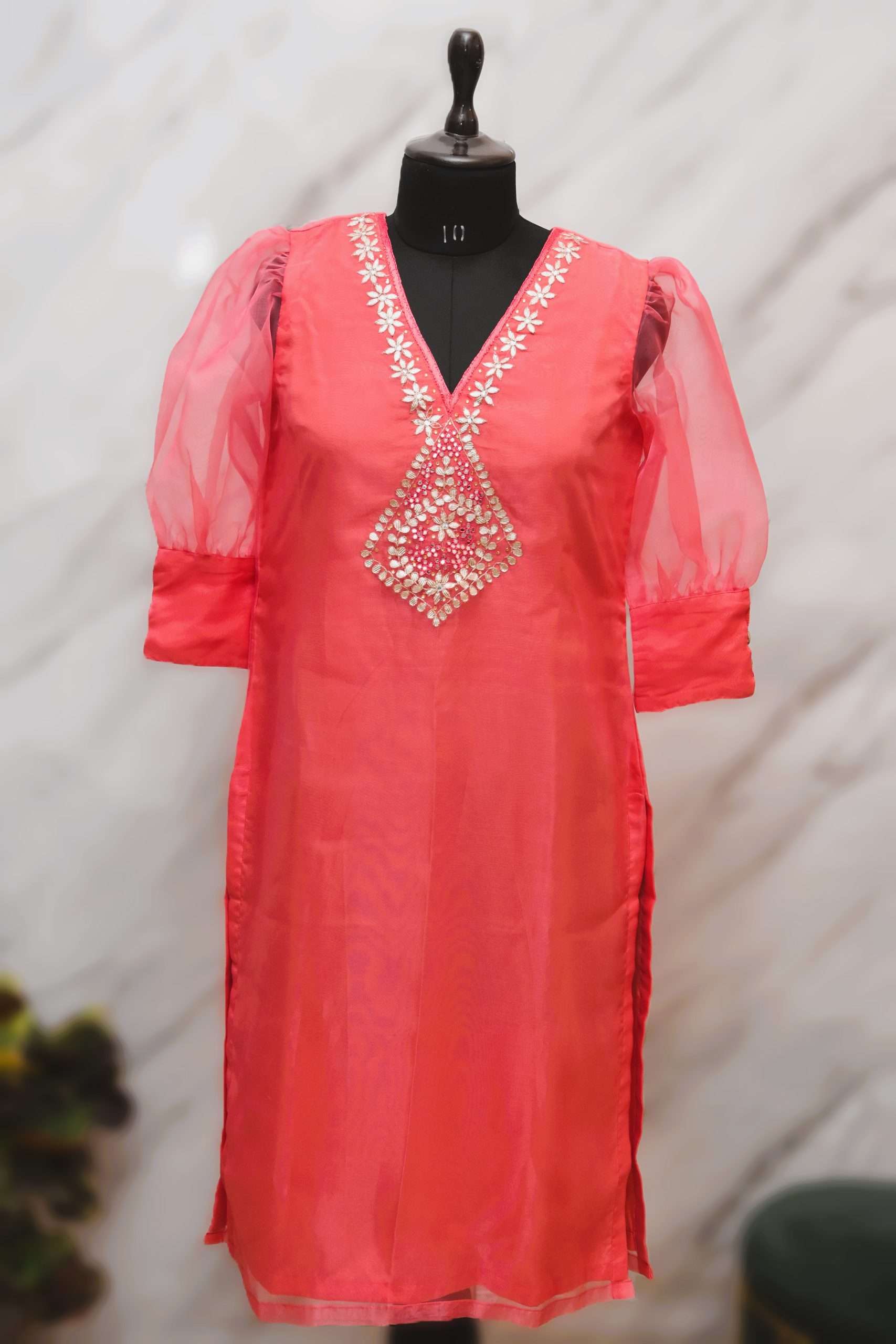 peachy-pink kurta in Orgenza has gota patti work on neckline.