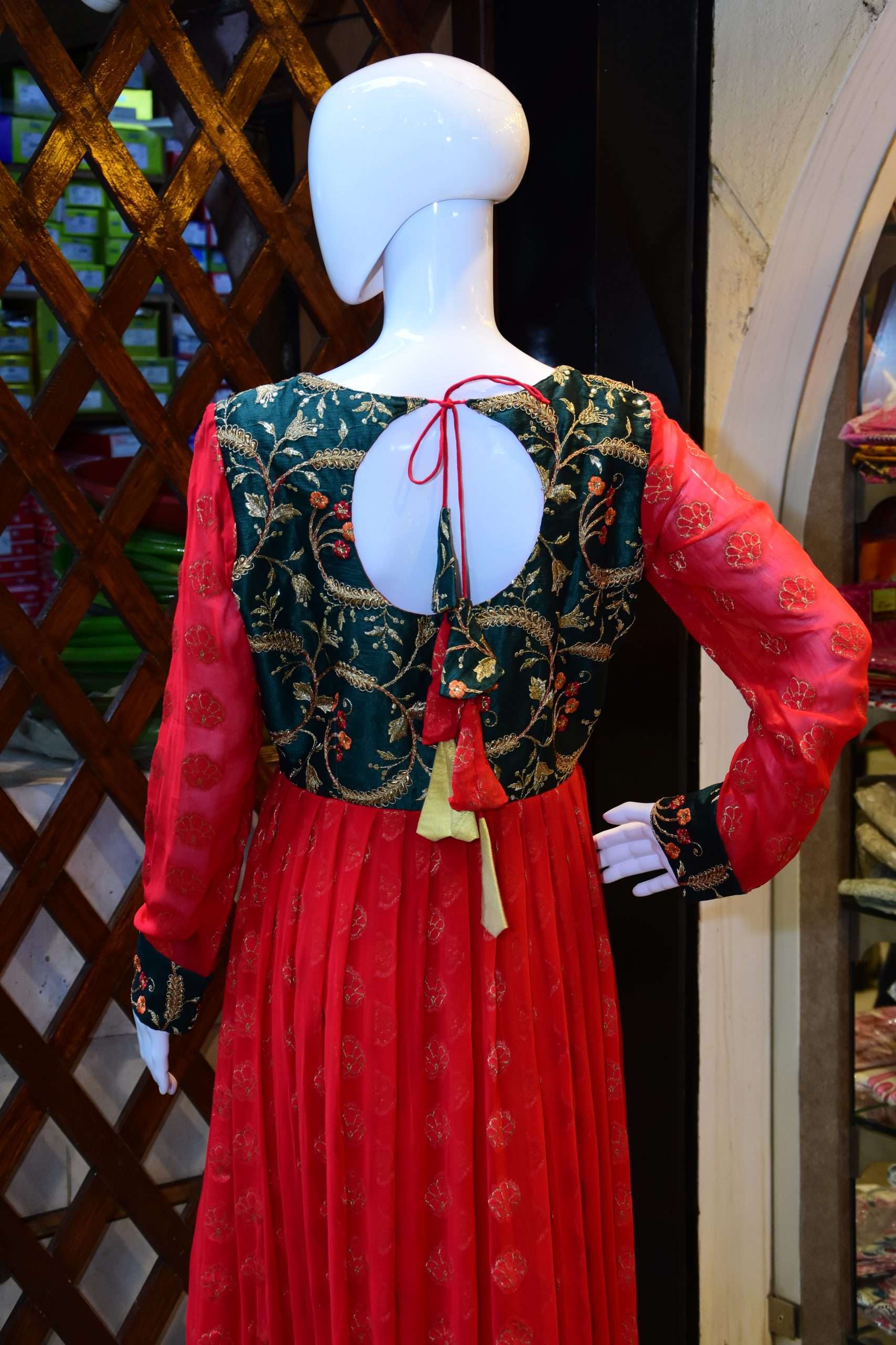 Pick this tomato- red anarkali dress with a Wash Care: Dry Clean Only beautiful angrakha- style yoke neck design to give a royal vibe at special events! Paired with a contrasting green color crepe dupatta and bottom.